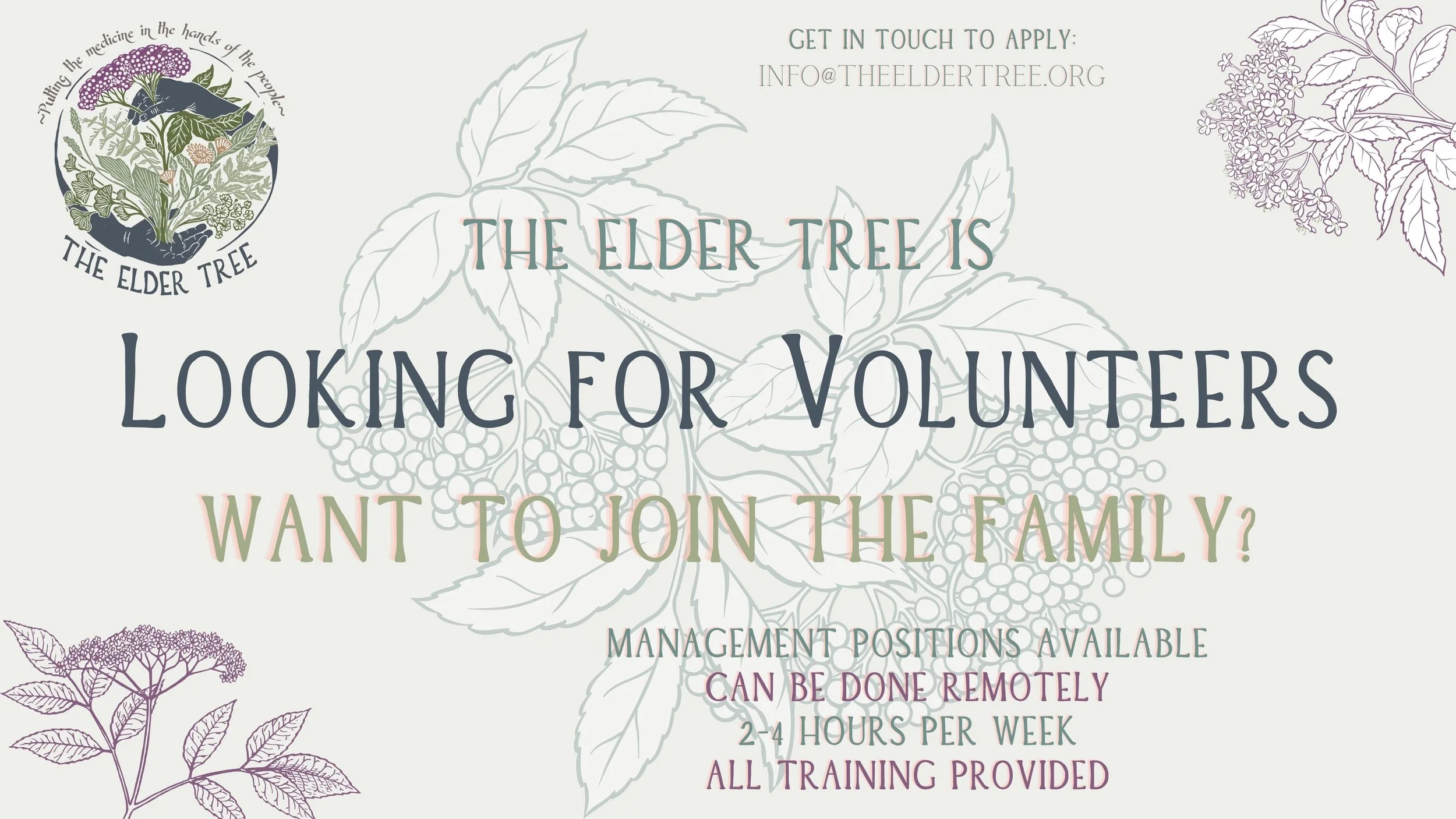We are currently looking for some additional tech support and graphic design support for The Elder Tree. We are also looking for a new treasurer to join our amazing team!